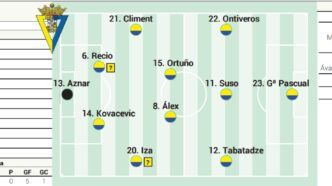 La alineación que se perfila para el partido es la siguiente: Aznar; Iza, Kovacevic, Recio, Climent; Álex, Ortuño; Tabatadze, Suso, Ontiveros; y García Pascual.
