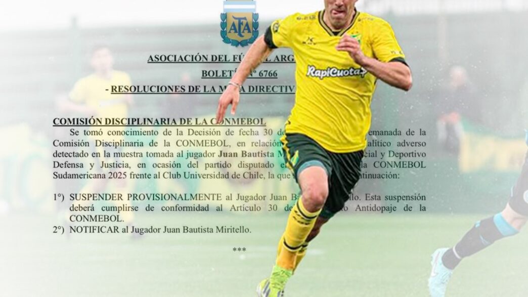 Un futbolista de Defensa y Justicia ha sido suspendido por un mes tras dar positivo en un control antidoping de la Conmebol. El jugador involucrado es Juan Miritello.