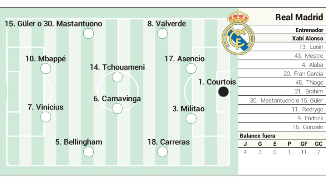 La alineación tentativa que Xabi Alonso podría presentar frente al Getafe es la siguiente: Courtois; Valverde, Asensio, Militao, Carreras; Güler o Mastantuono, Tchouaméni, Camavinga, Bellingham; Mbappé y Vinicius.