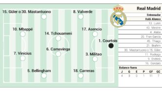 En la línea defensiva, ante las ausencias de Huijsen, Carvajal, Rüdiger y Mendy, Asensio se perfila como compañero de Militao en el centro de la defensa. Carreras ocuparía el costado izquierdo, mientras que Valverde actuaría en el lateral derecho. Alaba y Fran García quedarían como alternativas en el banquillo.